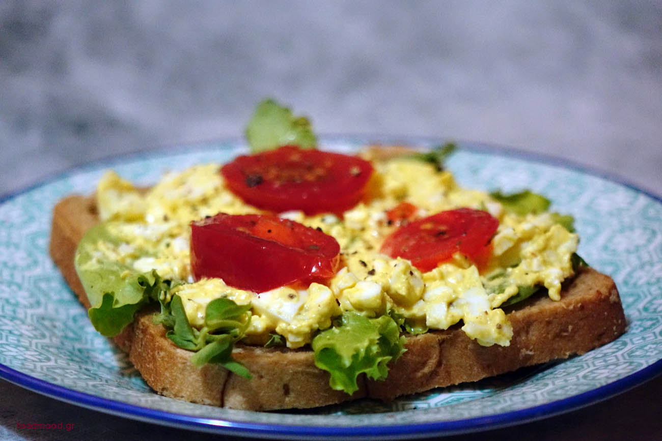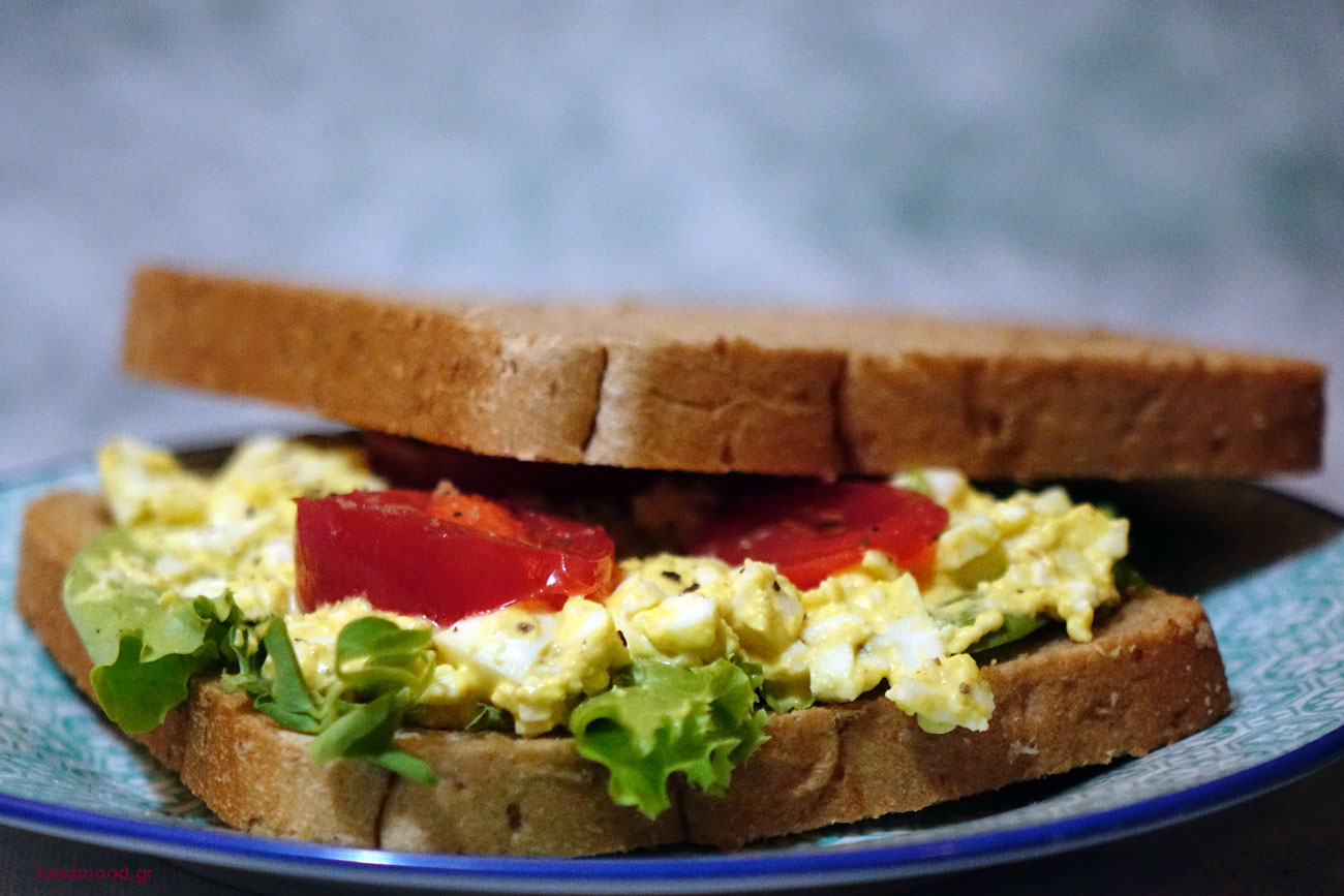 Κόψτε και ανακατέψτε καλά τα αυγά με τη μουστάρδα, τη μαγιονέζα κα τα μυρωδικά. Αλείψτε μία φέτα ψωμί με την αυγοσαλάτα, βάλτε λίγο μαρουλάκι και τις φέτες ντομάτας.