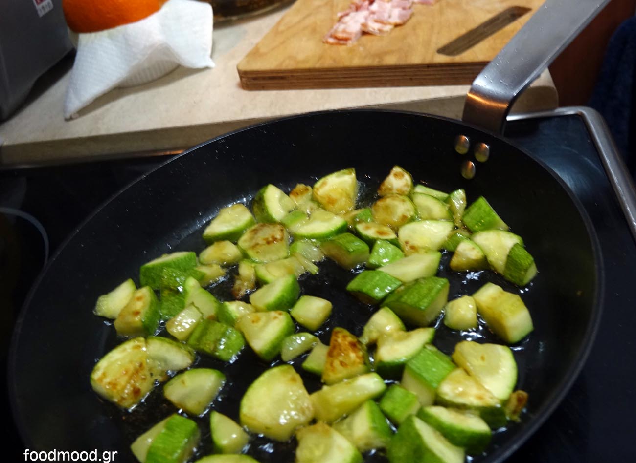 Θα χρειαστούμε ένα κολοκυθάκι, 2-3 φέτες μπέϊκον, 2 αυγά, 100 ml γάλα, 12 φέτες ψωμί του τοστ, λίγο φέτα ή κεφαλοτύρι, πιπέρι.