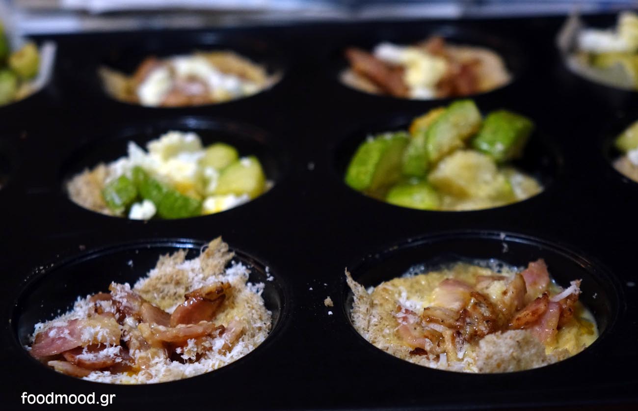 Κόβουμε το κολοκυθάκι σε τετράγωνα μικρά κομματάκια και το σοτάρουμελίγο να μαλακώσει.Το βάζουμε στην άκρη. Ψιλοκόβουμε το μπέϊκον και το γυρνάμε λίγο στο τηγάνι.Σε ένα μπολ χτυπάμε τα αυγά με το γάλα. Κόβουμε με ένα στρογγυλό τσέρκι τις φέτες ψωμιού. Λαδώνουμε μικρές φορμίτσες ( αυτές που κάνουμε τα cupcakes) και βάζουμε την στρογγυλή φέτα ψωμιού για βάση. Βάζουμε στα μισά ψωμάκια λίγο από το κολοκυθάκι και στα υπόλοιπα το μπέϊκον. Προσθέτουμε την φέτα τριμμένη ή το κεφαλοτύρι.Ρίχνουμε σε κάθε φορμίτσα 2-3 κουταλιές απο το μείγμα με τα αυγά και λίγο πιπέρι.