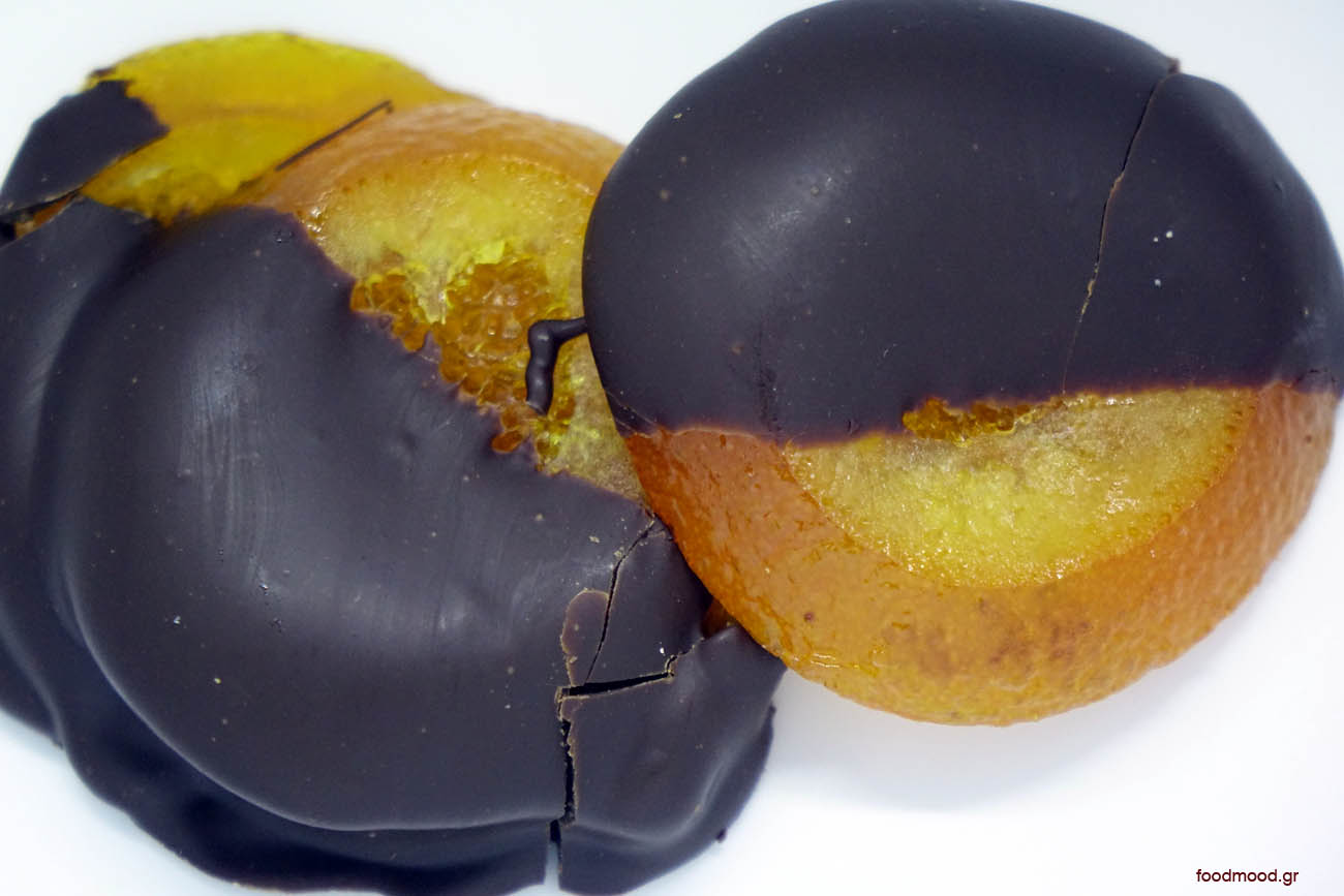 Μπορούμε αντί να τις ζαχαρώσουμε να τις βουτήξουμε σε σοκολάτα. Λιώνουμε μιά σοκολάτα σε μπεν μαρί. Και βουτάμε το μισό μέρος από τις φλούδες ή τα κομμένα πορτοκάλια στη σοκολάτα. Αφήνουμε σε σχάρά να κρυώσουν και να στερεοποιηθεί η σοκολάτα.